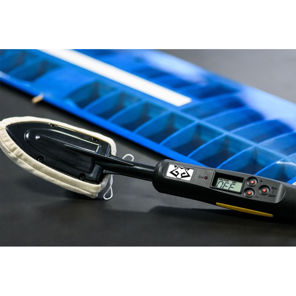 Professzionális modell bevonó vasaló teflonbevonatú testtel, nagyon pontos elektronikus hőmérséklet-szabályozással és az üzemi hőmérséklet digitális kijelzésével az LCD kijelzőn.