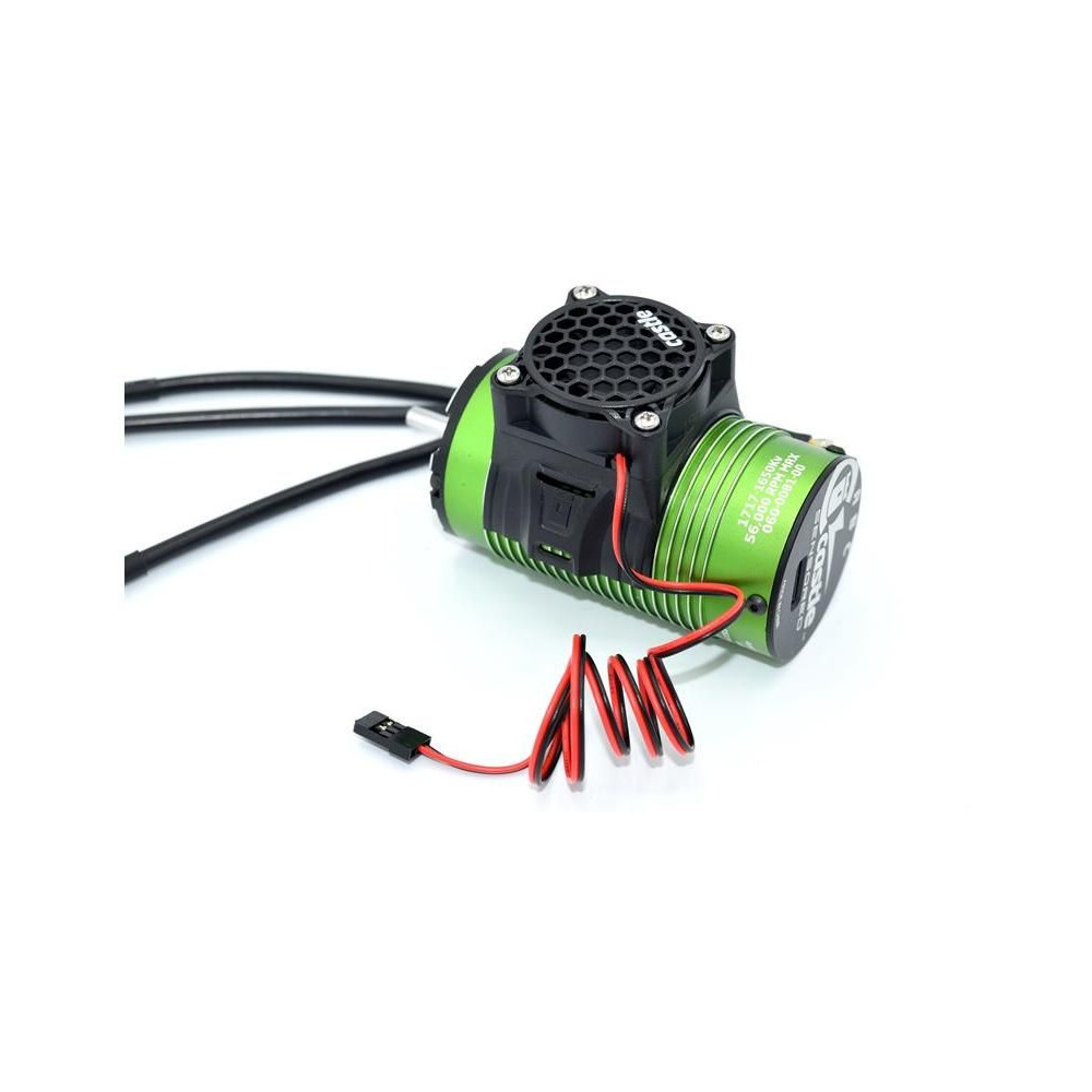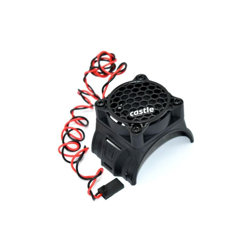 Castle aktív hűtő ventilátorral - 40 x 40 x 7 mm. 46 mm külső átmérőjű motorokhoz, mint például a Castle 17xx sorozat. Könnyen felszerelhető a vonórudak segítségével. Tápellátás a vevőegységből (max. 8,4 V). Maximális fordulatszám 10 000 fordulat/perc.