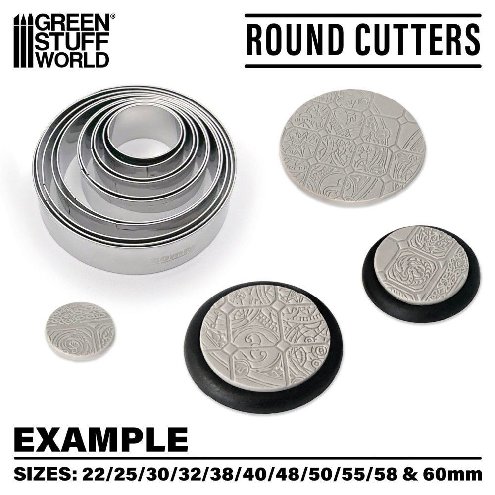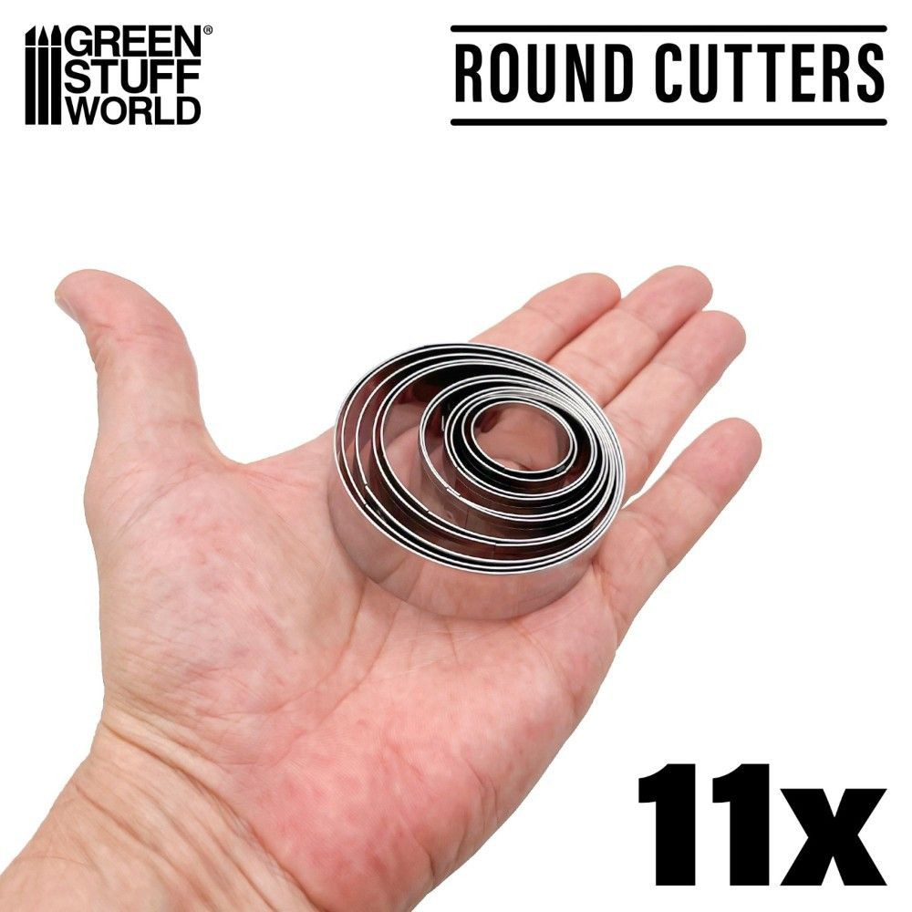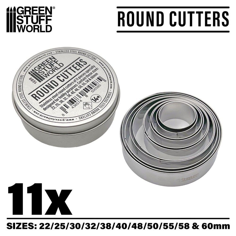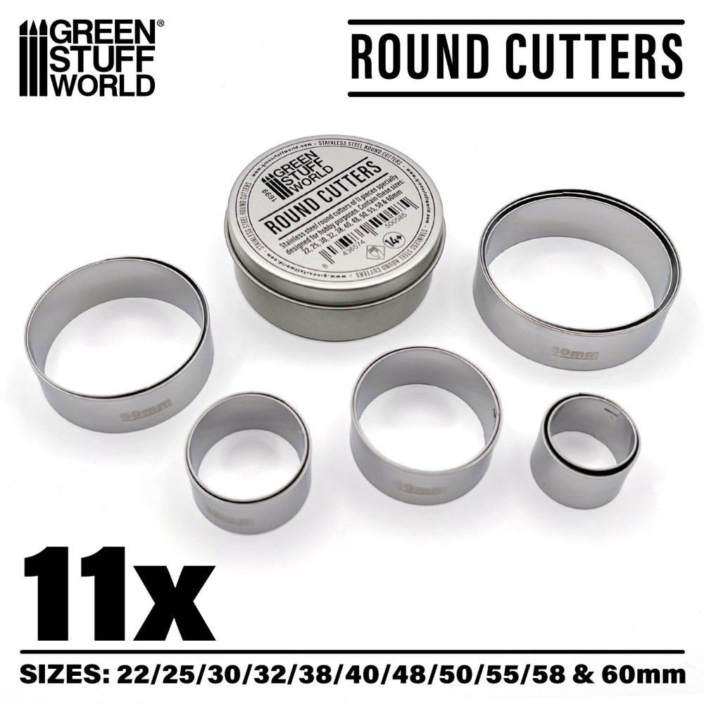 Ez a 11 darabos rozsdamentes acél kerek kivágó készlet ideális modellalapok gyors és pontos elkészítéséhez agyagból és gittből. 22 mm-től 60 mm-es átmérőig terjed, így minden szabványos háborús játékbeli igényt lefed. A kivágók tartósak, könnyen karbantarthatók és tiszta vágásokat biztosítanak az anyag vetemedése nélkül.