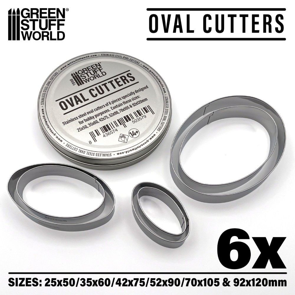 6 darabos rozsdamentes acél ovális kivágó készlet, amely gittből és agyagból készült modellalapok gyors elkészítéséhez készült. Tartalmazza a leggyakrabban használt méreteket háborús játékokhoz, beleértve az Age of Sigmar rendszereket is, 25x50 mm-től 90x120 mm-ig. A szerszámok tiszta vágást és nagy tartósságot garantálnak gyakori használat esetén.