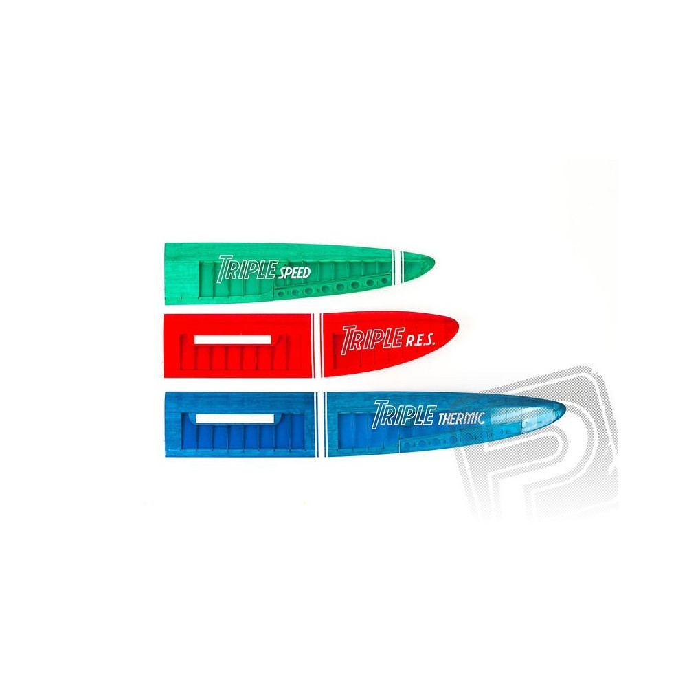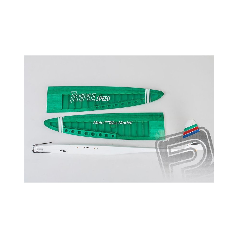 Ez a vadonatúj koncepció egy vonzó törzset kombinál egy pillangó farokszárnnyal (a készlet tartalmazza az E-power opciót) a szárny típusának kiválasztási lehetőségével a várható repülési típusnak megfelelően. Mindegyik szárny ugyanarra a törzsre csatlakozik. Erőteljes mágnesek tartják a szárnyakat a helyükön, így szerszámok nélkül könnyen és gyorsan cserélhetőek.tripla sebesség - 178 cm szárnyhossz, egyenes szárnyfesztávolság és hosszú szárnyvégek. A szárnyrész egyenes aljjal rendelkezik, könnyen megépíthető és ideális műrepüléshez és lenyűgöző végsebességhez.Triple R.E.S. - a szárny hossza 199 cm és a "Triple thermic"-nél markánsabb formájú. Rádióvezérlésű mozgatható farokszárny és aileronok, mindez az R.E.S. követelményeinek megfelelően.Triple Thermic - a szárny hossza 255 cm és aileronokkal és spoilerekkel van felszerelve. A szárnyrész optimalizált a termikus emelkedésre, és kiváló repülési tulajdonságokat és teljesítményt biztosít. a karcsú törzs nagyon jó aerodinamikai teljesítményt nyújt. Az elektromos E-teljesítményre szánt törzs szélesebb orral rendelkezik, amely 28 mm-es kifutóval szerelhető fel, és helyet biztosít egy 2500 mAh kapacitású 3s-LiPo akkumulátor számára. Mindkét változat rendelkezik mágnesesen levehető pilótafülkefedéllel és egy levehető fedéllel a törzs alján, amely hozzáférést biztosít a vezérlő szervókhoz. a Triple mindhárom változata teljes egészében fából készült, hangsúlyozva a modellépítésű kialakítást, amely az Aero-nauts régi hagyománya. A könnyű kivitelű balsa törzs és a jól átgondolt koncepció biztosítja a gyors építési folyamatot, minimális hibalehetőséggel. A V-farok precíziós, lézervágott alkatrészekből áll kirakós mintázatban a kiváló eredmény érdekében. A szárnyak hagyományos bordákat és alkatrészeket használnak, és csak egy sík építőszerkezetet igényelnek. A belépő élek összeszerelt alkatrészek, és a könnyű súlyt jó szilárdsággal kombinálják. a Triple segítségével még azok is sikerrel járnak, akik ki akarják próbálni a modellépítést, és rövid idő alatt megépíthetik saját vitorlázórepülőgépüket vagy elektromos hajtású vitorlázórepülőgépüket. A repülési tulajdonságok kiválóak, és biztosítják, hogy még a kezdők vagy a kevésbé tapasztalt pilóták is élvezhetik a szórakozást. Ez a készlet tartalmazza a modell megépítéséhez szükséges összes lézervágott fa alkatrészt, lucfenyő alkatrészeket, bowdeneket, vezérlőrudakat és egy csomag kis összekötő alkatrészt. A részletes építési útmutató grafikákkal és lépésről-lépésre haladó szöveggel minden kérdésre választ ad.