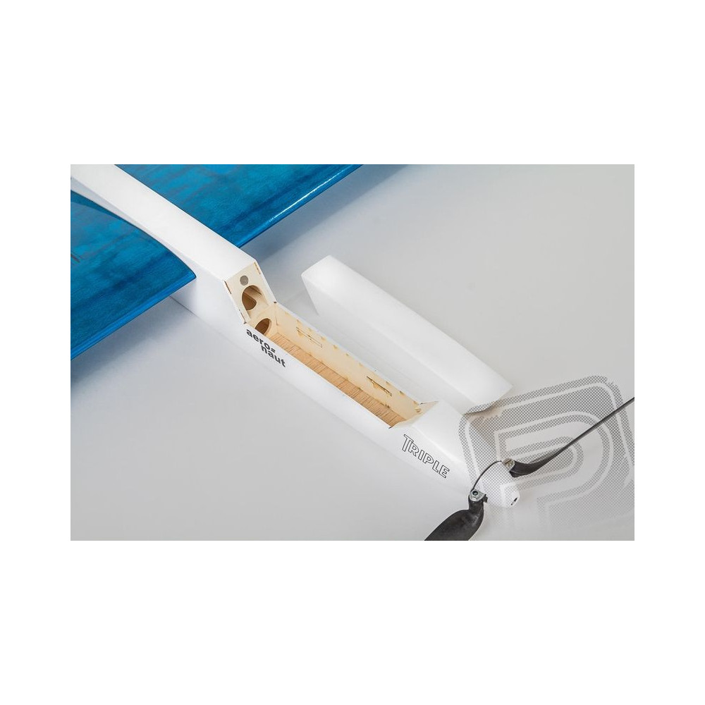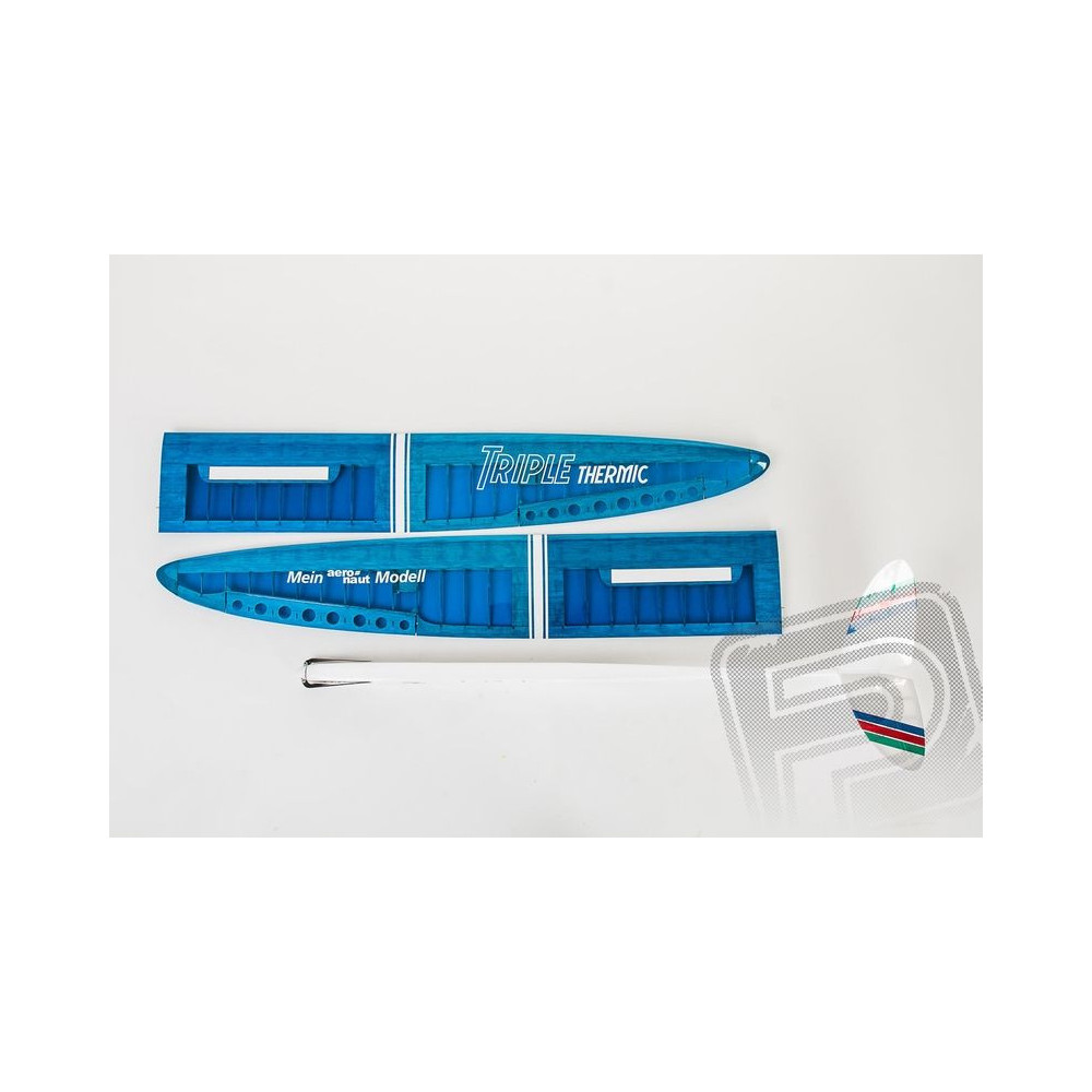 Ez a vadonatúj koncepció egy vonzó törzset kombinál egy pillangó farokszárnnyal (a készlet tartalmazza az E-power opciót) a szárny típusának kiválasztási lehetőségével a várható repülési típusnak megfelelően. Mindegyik szárny ugyanarra a törzsre csatlakozik. Erőteljes mágnesek tartják a szárnyakat a helyükön, így szerszámok nélkül könnyen és gyorsan cserélhetőek.tripla sebesség - 178 cm szárnyhossz, egyenes szárnyfesztávolság és hosszú szárnyvégek. A szárnyrész egyenes aljjal rendelkezik, könnyen megépíthető és ideális műrepüléshez és lenyűgöző végsebességhez.Triple R.E.S. - a szárny hossza 199 cm és a "Triple thermic"-nél markánsabb formájú. Rádióvezérlésű mozgatható farokszárny és aileronok, mindez az R.E.S. követelményeinek megfelelően.Triple Thermic - a szárny hossza 255 cm és aileronokkal és spoilerekkel van felszerelve. A szárnyrész optimalizált a termikus emelkedésre, és kiváló repülési tulajdonságokat és teljesítményt biztosít. a karcsú törzs nagyon jó aerodinamikai teljesítményt nyújt. Az elektromos E-teljesítményre szánt törzs szélesebb orral rendelkezik, amely 28 mm-es kifutóval (pl. AXI 2212/20 V2 LONG) szerelhető fel, és helyet biztosít egy 2500mAh kapacitású 3s-LiPo akkumulátornak. Mindkét változat rendelkezik mágnesesen levehető pilótafülkefedéllel és egy levehető fedéllel az alsó törzsön, amely hozzáférést biztosít a vezérlő szervókhoz. a Triple mindhárom változata teljes egészében fából készült, hangsúlyozva a modellépítést, amely az Aero-nauts-nál régi hagyomány. A könnyű kivitelű balsa törzs és a jól átgondolt koncepció biztosítja a gyors építési folyamatot, minimális hibalehetőséggel. A V-farok precíziós, lézervágott alkatrészekből áll, kirakós mintázatban, a kiváló eredmény érdekében. A szárnyak hagyományos bordákat és alkatrészeket használnak, és csak egy sík építőszerkezetet igényelnek. A belépő élek összeszerelt alkatrészek, és a könnyű súlyt jó szilárdsággal kombinálják. a Triple segítségével még azok is sikerrel járnak, akik ki akarják próbálni a modellépítést, és rövid idő alatt megépíthetik saját vitorlázórepülőgépüket vagy elektromos hajtású vitorlázórepülőgépüket. A repülési tulajdonságok kiválóak, és biztosítják, hogy még a kezdők vagy a kevésbé tapasztalt pilóták is élvezhetik a szórakozást. Ez a készlet tartalmazza a modell megépítéséhez szükséges összes lézervágott fa alkatrészt, lucfenyő alkatrészeket, bowdeneket, vezérlőrudakat és egy csomag kis összekötő alkatrészt. A részletes építési útmutató grafikákkal és lépésről-lépésre haladó szöveggel minden kérdésre választ ad.