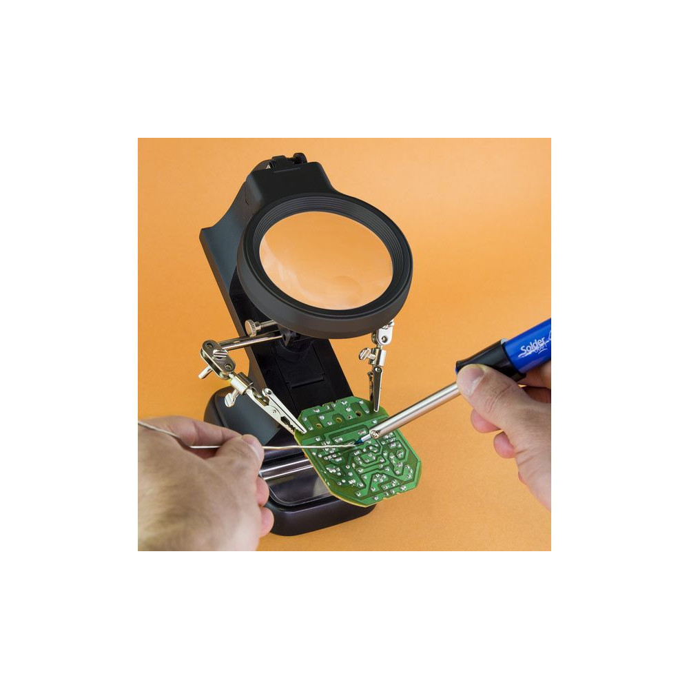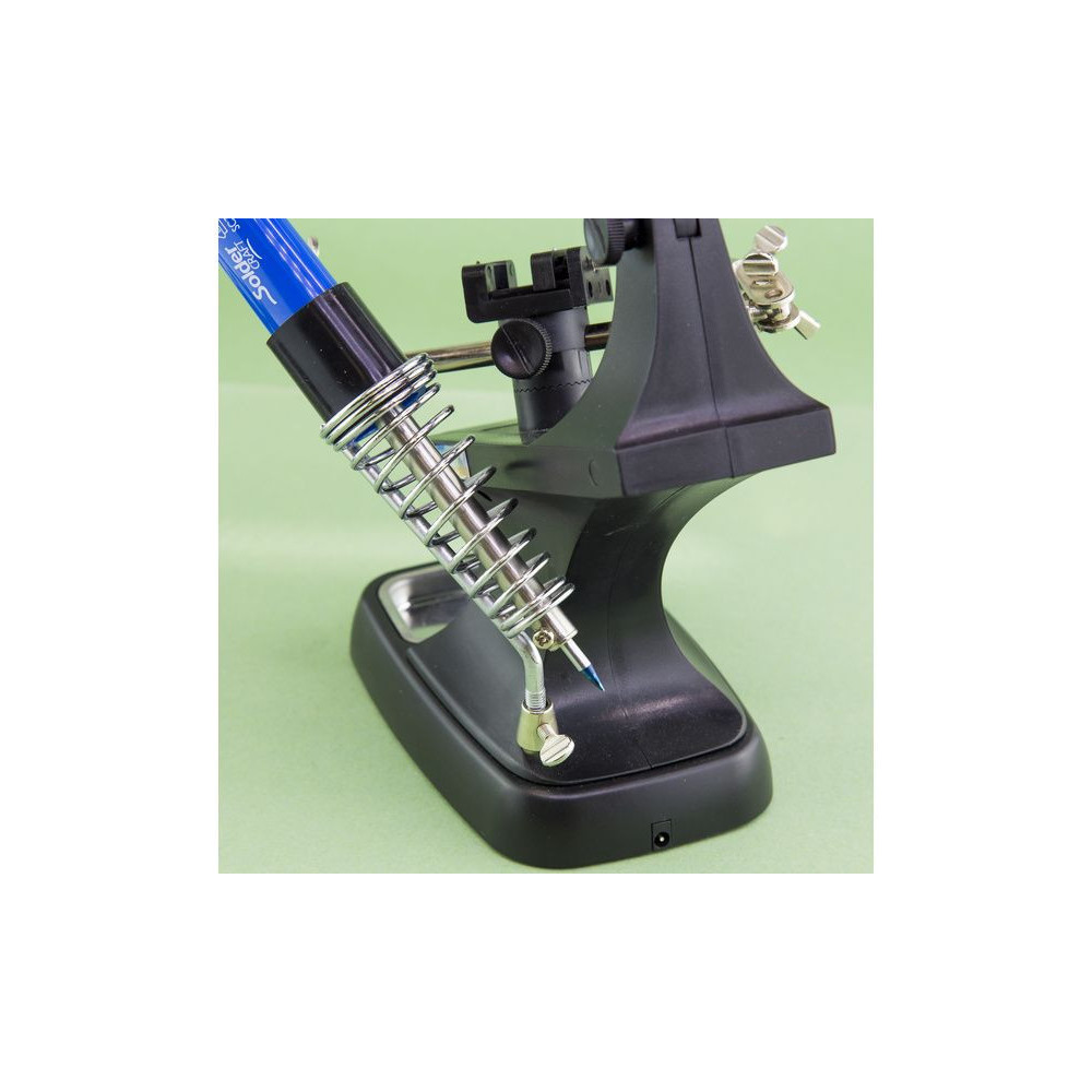 A LED-es megvilágítás 10 darab LED-ből áll. A nagyító háromszoros nagyítással rendelkezik. A mikroforrasztópáka tartója a tartozék.