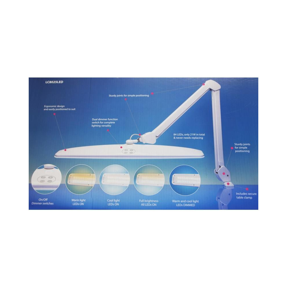 Lightcraft Compact LED 21W-os kompakt asztali lámpa fényerőszabályzóval és állítható színhőmérséklettel. A lámpa 84 SMD LED-del, az asztalra való rögzítéshez egy bilinccsel, a pontos pozícionáláshoz stabil, 40 cm hosszú csuklós karokkal rendelkezik.