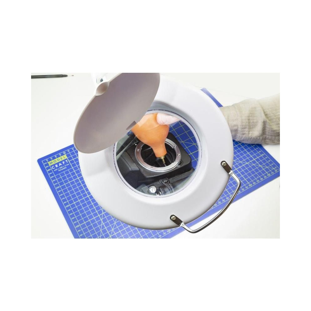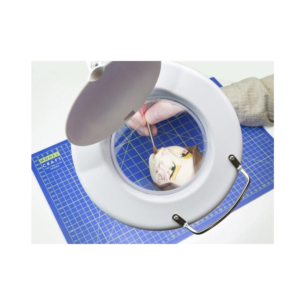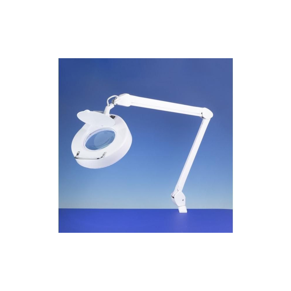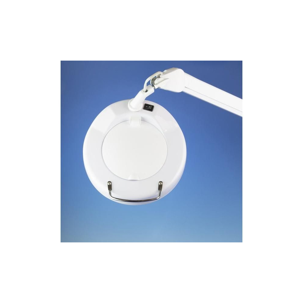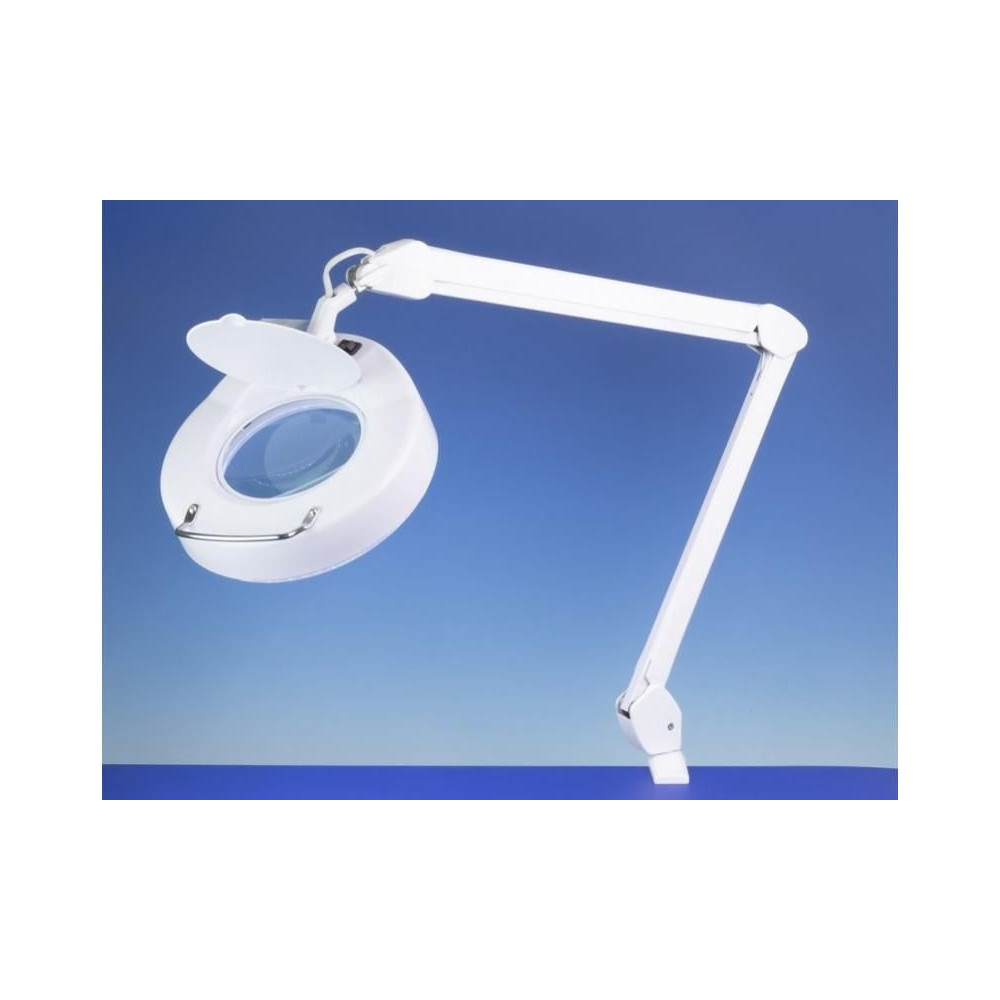 Energiatakarékos LED-es nappali lámpa kiváló minőségű nagyító lencsékkel. Rugalmas csuklós kar nagy hatótávolsággal a pontos pozícionáláshoz csúszás nélkül. Kiváló minőségű 125 mm-es lencse, 3 dioptriával (1,75x nagyítás). 90 LED 6400K színhőmérsékletű, mindössze 6W fogyasztással, hálózati tápellátással. Az asztalhoz való rögzítés az asztal szélén lévő csavarral ellátott konzollal történik, a konzolban a lámpa forgócsavarban van.