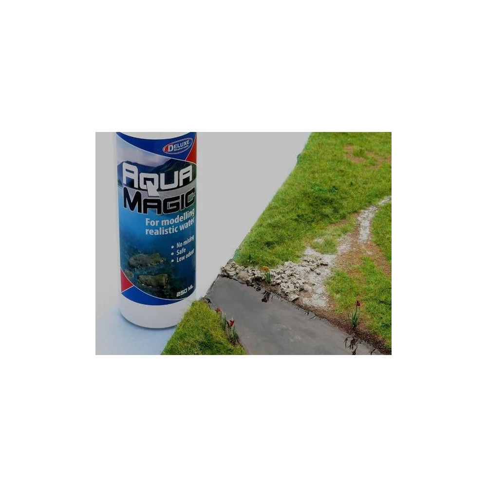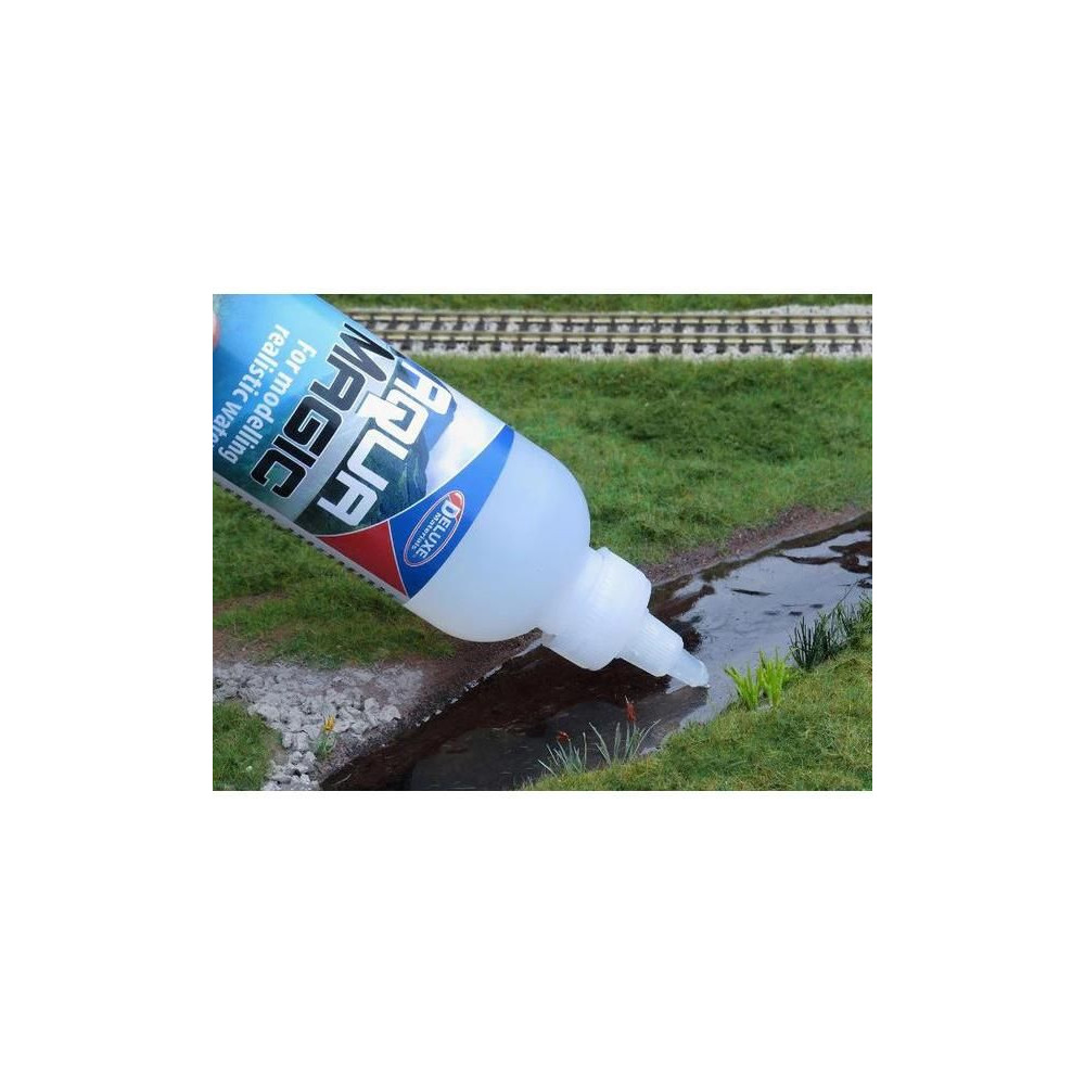 Az Aqua Magic by Deluxe Materials egy gél állagú folyadék valósághű vízfelületek (tavak, folyók, tócsák, sár) létrehozásához, a modellvasutak vagy diorámák tájképének megalkotásához. Szagtalan, azonos árnyalatú, nem fakul.