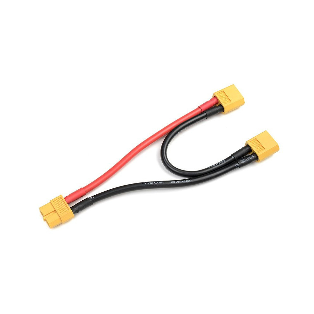 Soros Y-kábel XT-60 csatlakozókkal és 12AWG kábelekkel, hossza 12 cm. Két műszercsatlakozó (az akkumulátorokhoz) és egy akkumulátorcsatlakozó (a vezérlőhöz). Csak azonos típusú, feszültségű és kapacitású akkumulátorokat lehet sorba kötni!